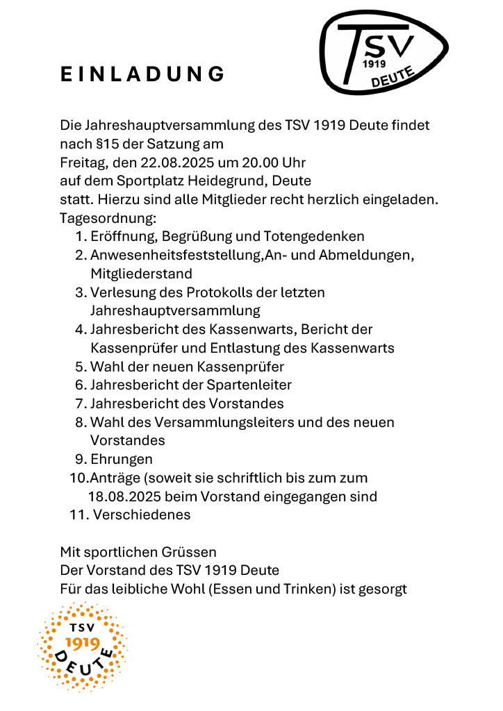- Treffen des Vorstands, erweiterten Vorstands und Gäste am Freitag, den 3. August 2018 um 19.30 Uhr Sportplatz Deute. Thema: 100 Jahre TSV in 2019