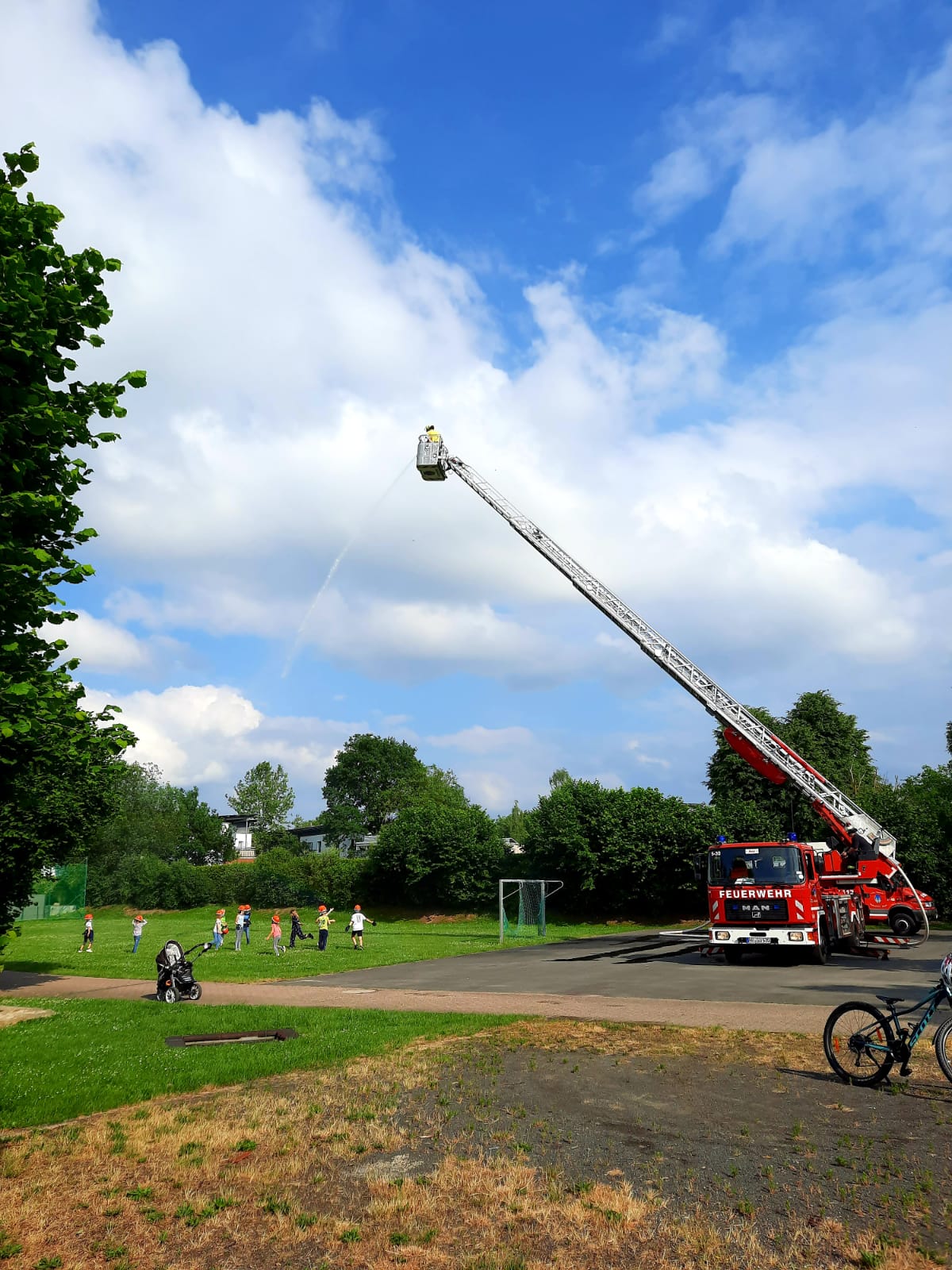 Als er oben ankam, öffnete er das Strahlrohr und die Kinder wurden unten mit vielen kleinen Wassertropfen nass gemacht, was bei den Temperaturen sehr Willkommen war.