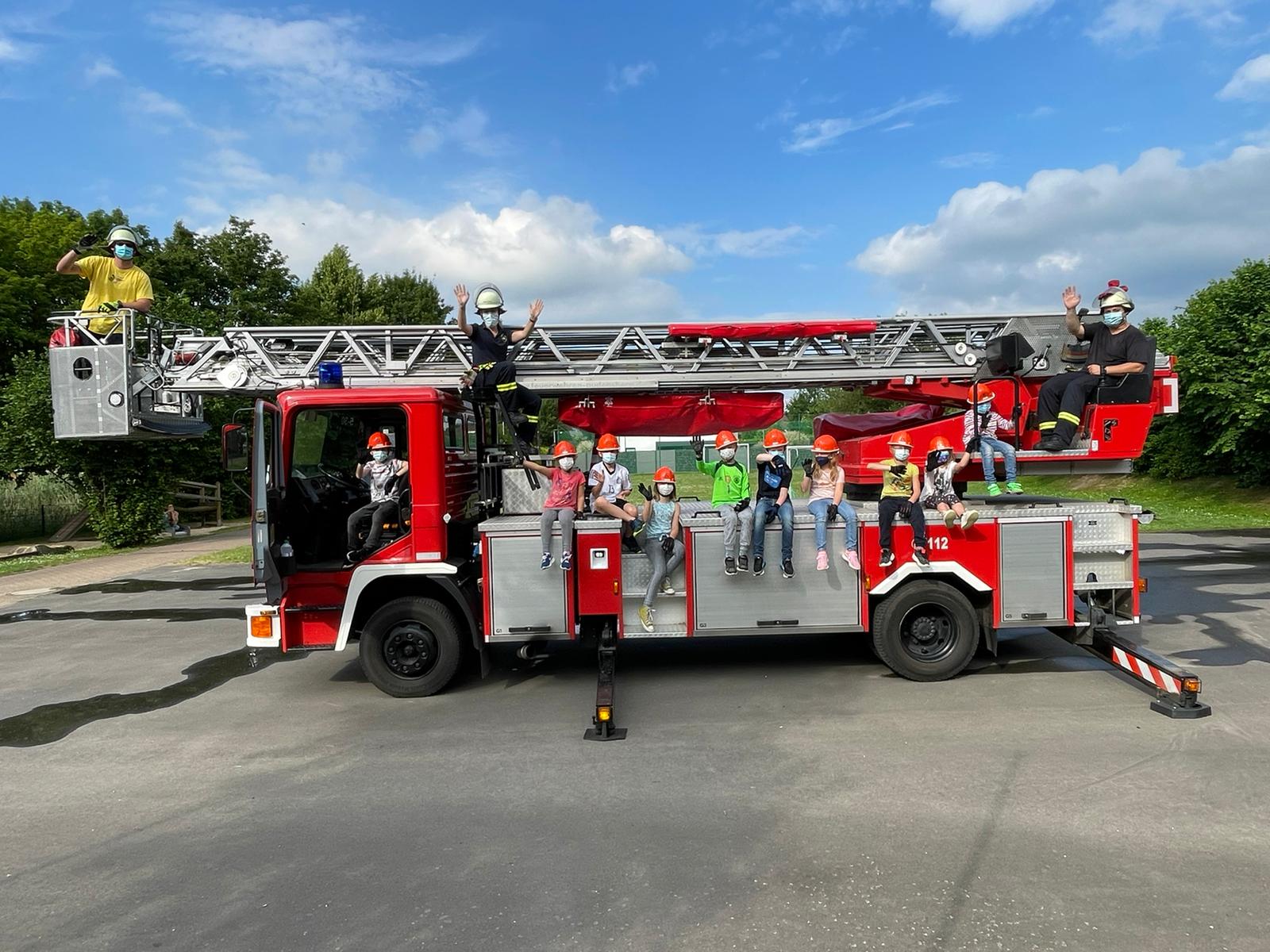 Zum Schluss gab es noch ein schönes Abschlussfoto und 2 Kinder durften mit der Drehleiter zurück zur Deuter Feuerwehr fahren. Wenn dass kein ereignisreicher Tag war, der Kinderherzen schneller schlagen ließ.