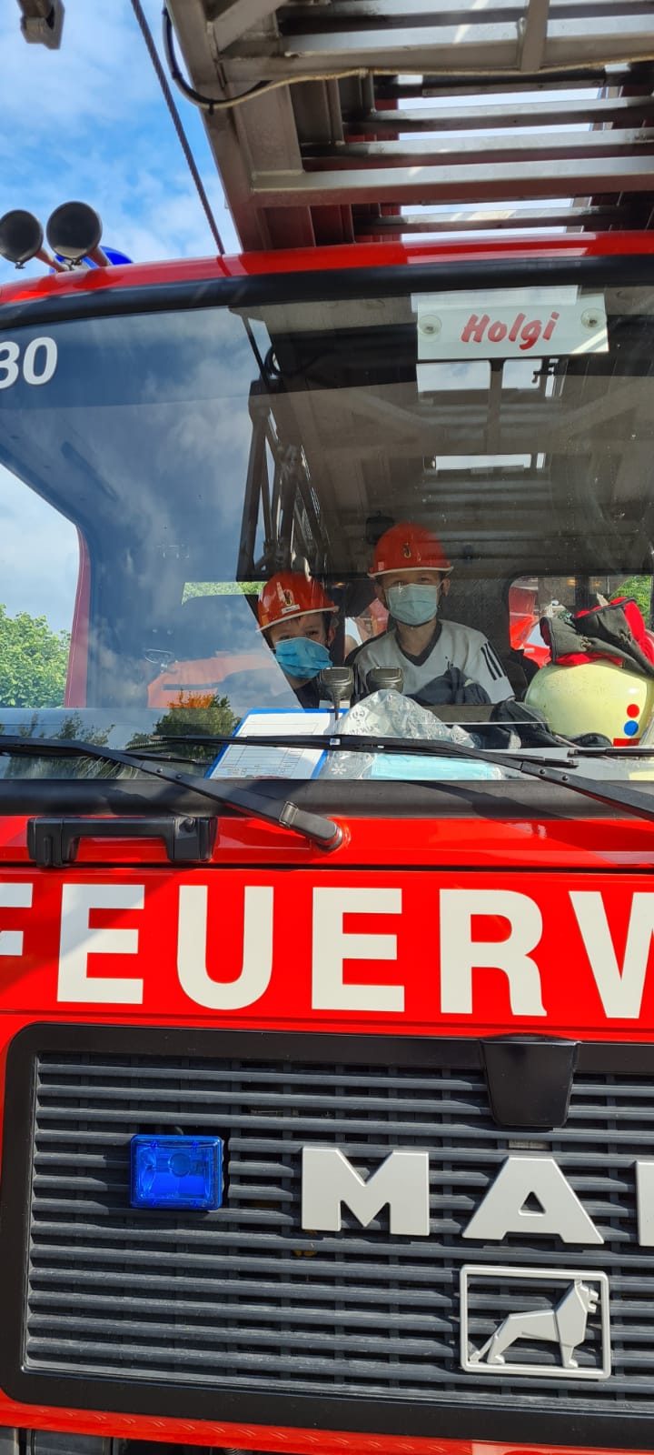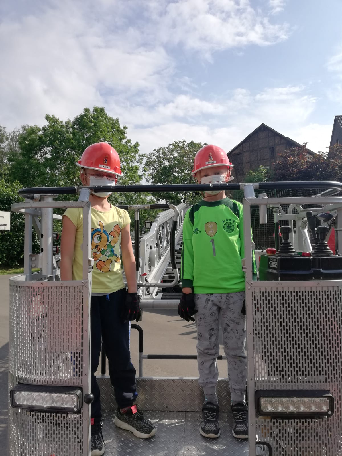 Zunächst haben sich die Kids an der Feuerwehr getroffen und dort ihre "Ausrüstung" (Helm und Handschuhe) angezogen. Dann ging die Fahrt mit dem ersten Feuerwehrfahrzeug zum Floriansplatz, wo schon die Drehleiter auf die Kinder wartete.
