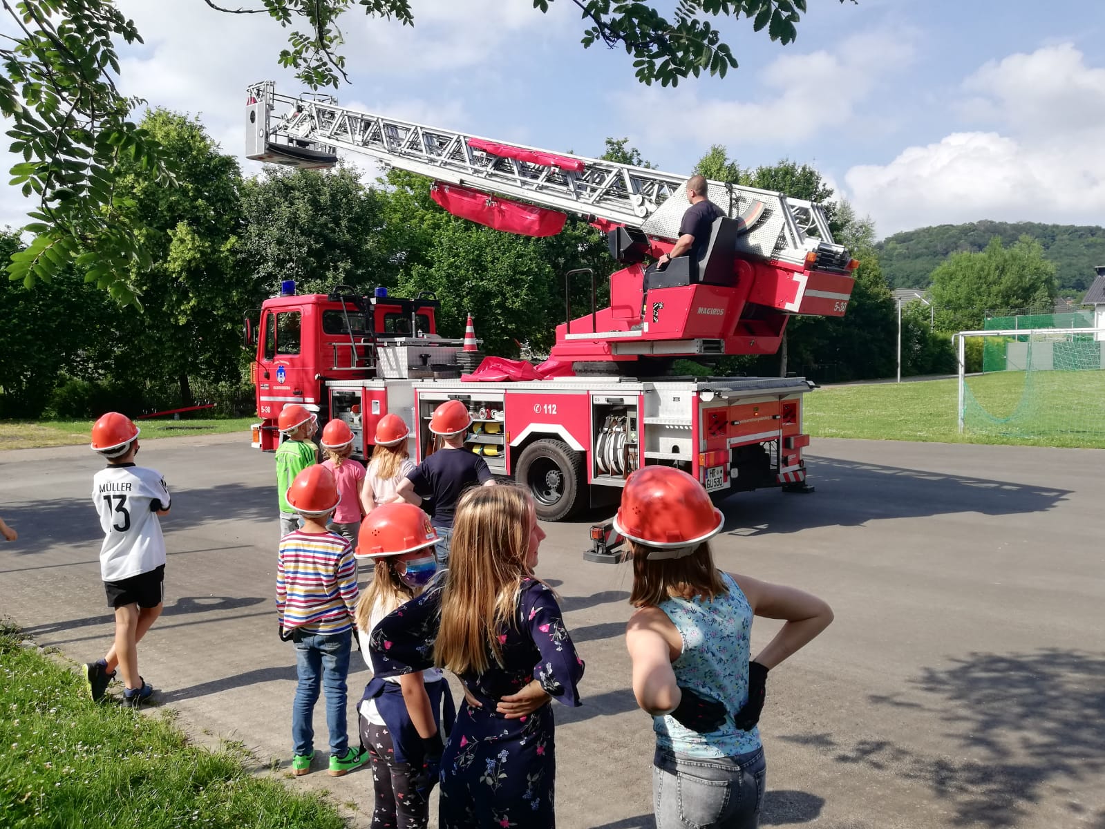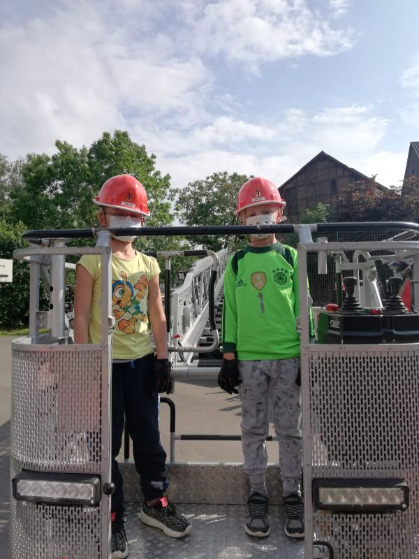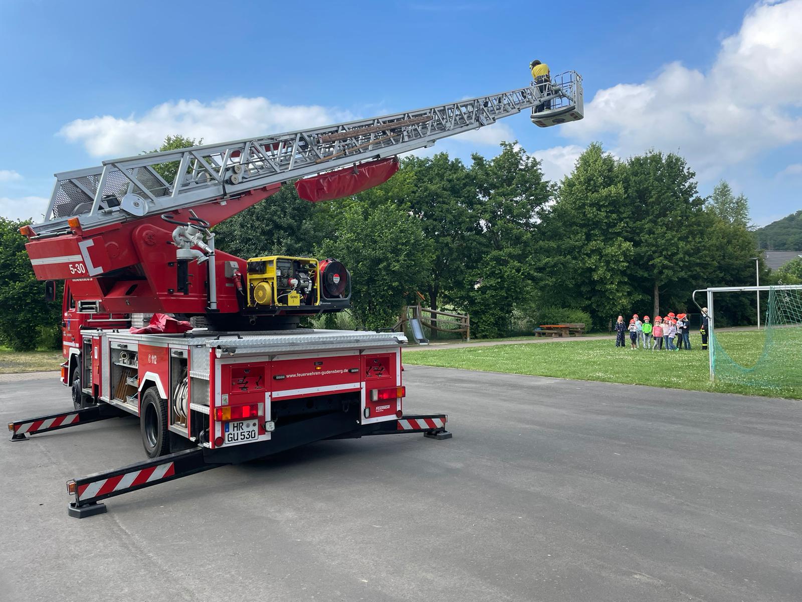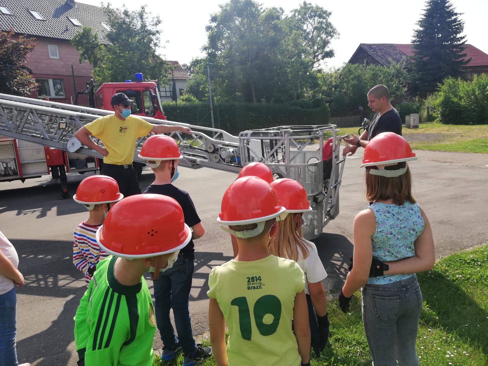 Dort wurde ihnen die Drehleiter von Marvin Happel erklärt und gezeigt. Die Drehleiter selbst wurde komplett ausgefahren, sodass die Kinder sehen konnten, wie hoch sie eigentlich ist.